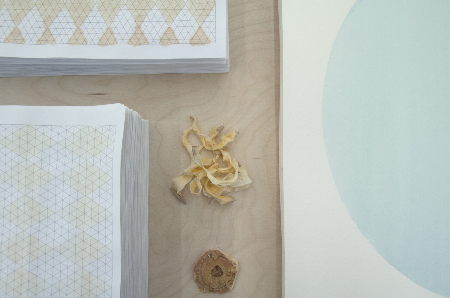 The title refers to the appearance of the new moon as the light reflected from earth reveals the dark side of the moon. Thus, emerge contemplations on cycles, nourishment, light, growth, time, and repetition. A drop of water containing blue-green algae lands as a bead on the surface of paper. As the water evaporates, the drop shrinks and the algae settle on the outskirts forming a darker ring delineating its border. With an oil drop, however, it is difficult to define its edge and to know when it has come to rest; a line must be approximated. In this work each series of daily practices and singular gestures are brought together, as colour transforms, edges bleed and forms come in and out of visibility.